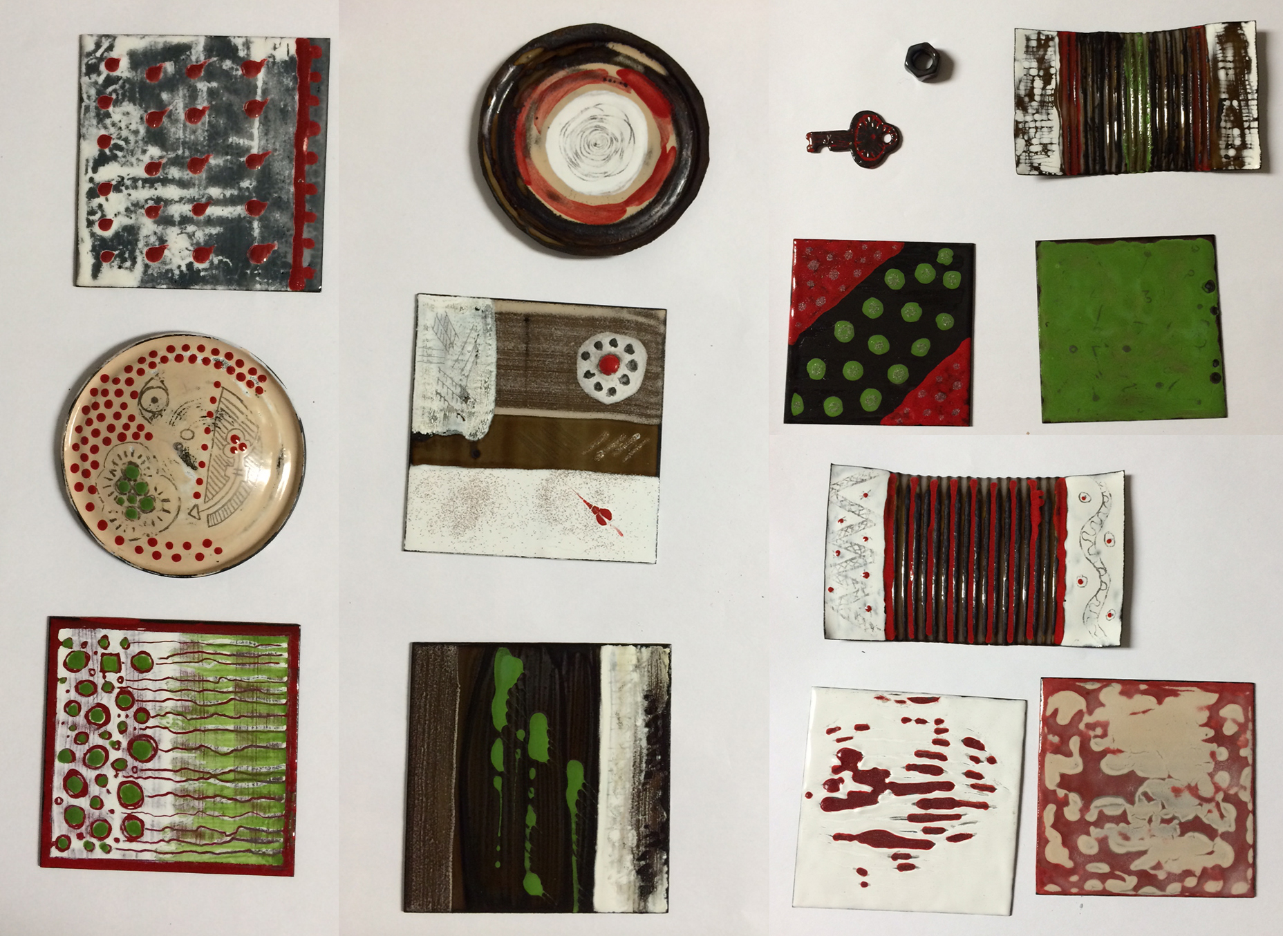 Montage of works January 28, 2014 1856 × 1354 Montage of works A montage of student works Samples made by Geoffrey, Dana, Sylvia and Todd L-R & clockwise) at Melissa Cameron’s Enamel on Steel workshop, 25th Jan 2014