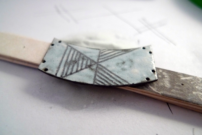 04 Melissa Cameron_Enamel Desk 03_2012 April 22, 2012 800 × 533 Two desk system The previous piece, fired once, with marker attaching glass sandblast beads Melissa’s last week of making for the Heat Exchange project