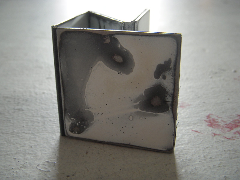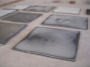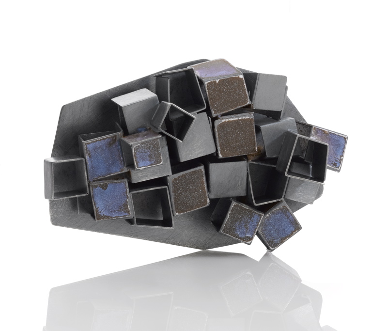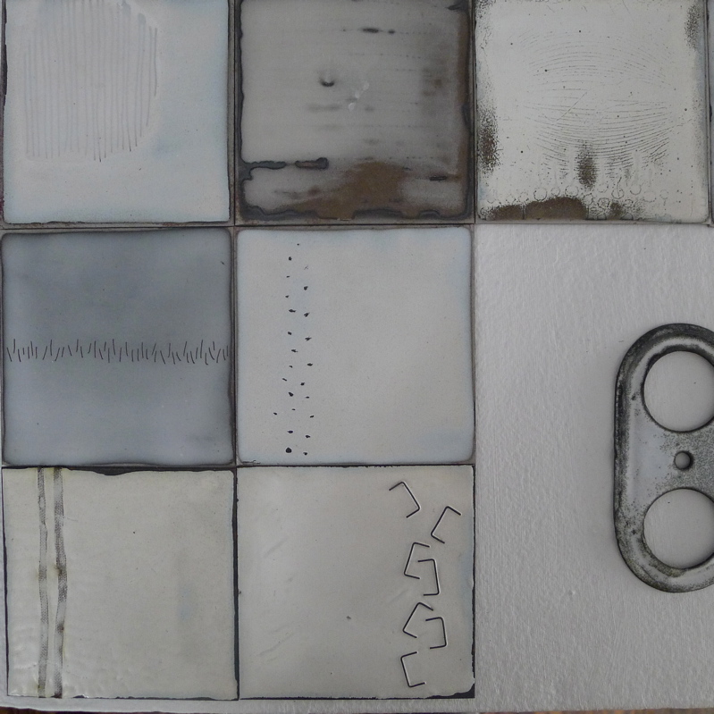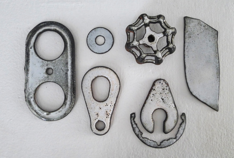 “These works are about singular moments collected while observing the winter landscape around my current home in North Carolina and my childhood home in New York State. The moments were solitary and quiet; some deliberate, others accidental. Through a process of experimentation with liquid enamel on steel, I reinterpreted and captured these moments, presenting them in ghostlike translucency, as echoes of the memories. Each enamel piece is also accompanied by found objects that are aged and worn. When arranged together, the enameled and found objects establish a narrative for the recollection of my observations.”
