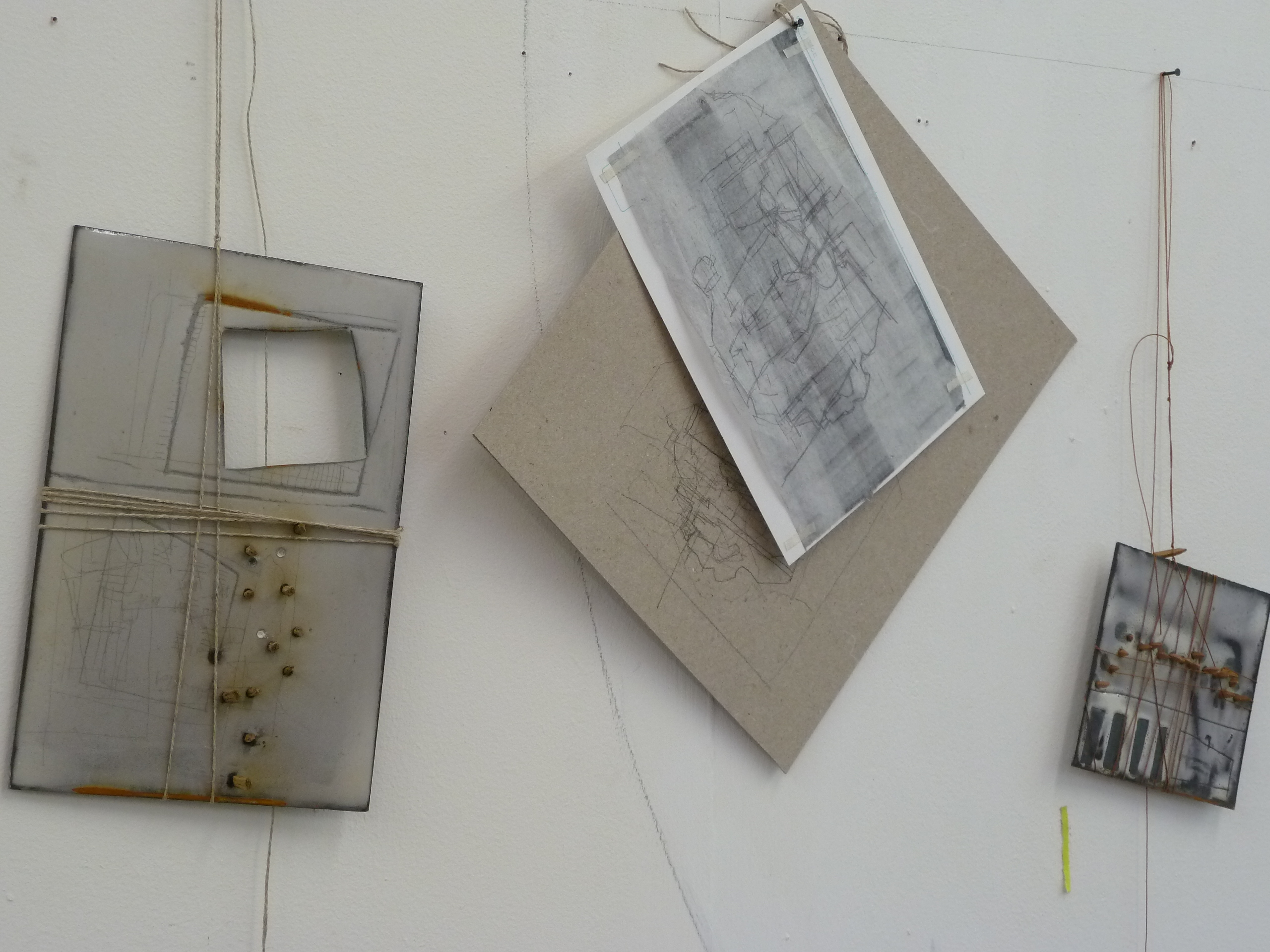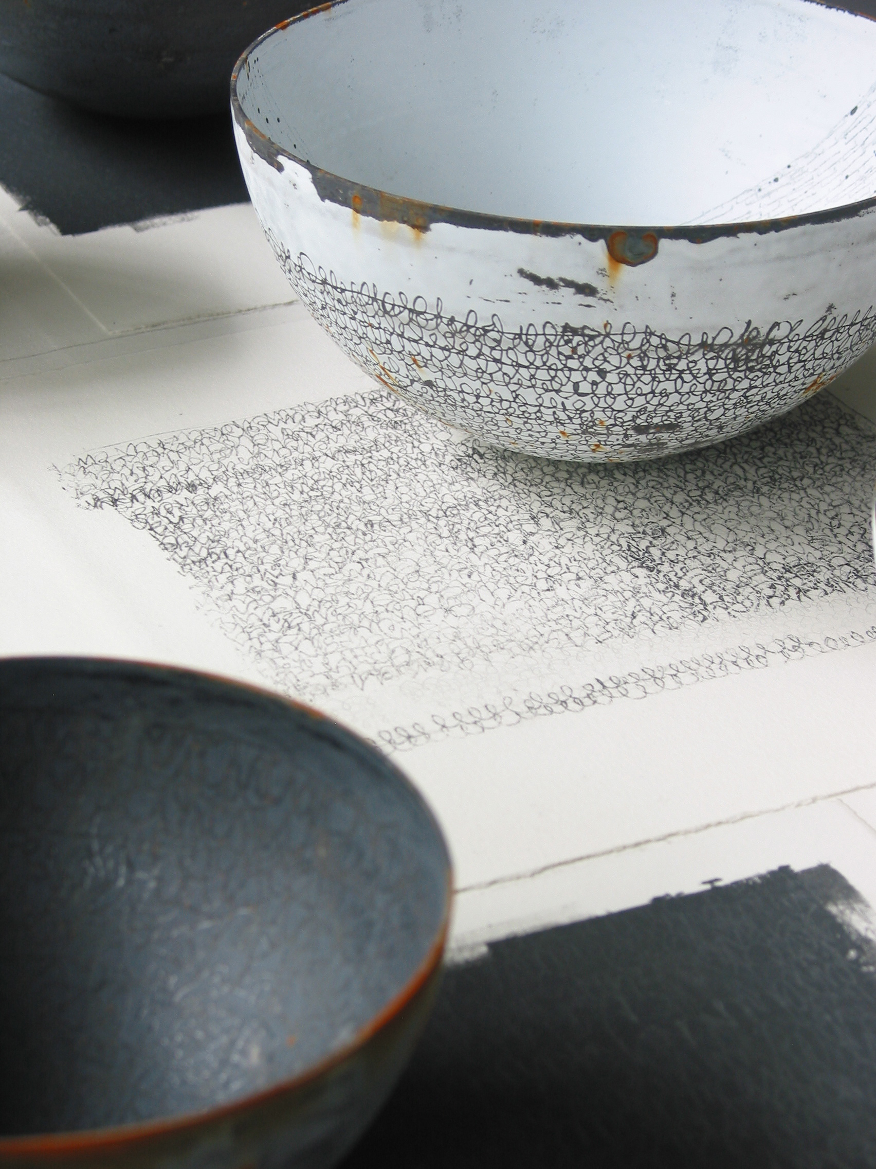 I have finally finished my work and have sent it to Elizabeth T who will kindly carry it to Phoenix. I haven’t had too much time in this project to really think and so the work is an amalgamation of ideas in progress. The blue pieces of oak are small gifts from my partner David…he works next to me and is a furniture designer and maker. Almost daily he leaves me small gifts of things/stuff that he makes or finds and these often go on to feature in my work. The blue pieces are the ends/offcuts of long planks of wood that he has been using in various commissions and projects. I have a rather nice collection of blue end-pieces in the shape of the letter H. I also had some work on my wall, some scraps of paper put together, which I had made in response to a visit to Amy Tavern’s studio at Penland a few years ago, where she introduced me to her collection of envelope papers…you can see in the image the same blue shape appearing…I hadn’t realised this until I looked back through my images. It reminded me of this blue wooden house that I have had since I was a child and a memory of these objects that kept flashing through my mind as I made this work. Finally the drawings on the enamel have been made as I walk and then repeated/scratched in the enamel. I guess this work is somehow about being home after travelling a great deal over the last few years…it’s a good feeling.
