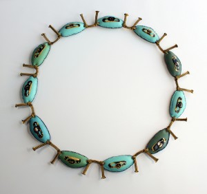 This small body of work titled, Treasure, was a response to a beautiful collection of 19th and early 20th century jewelry that was discovered after the passing of one of the members of my family. As I researched the jewelry and its history, I uncover filial relationships and family milestones that were marked by the giving of jewelry. I photographed a number of these jewels and converted them to enamel decals. These “jewel” images sit of the surfaces of organic “fleshy” forms, I have created, like a mark or tattoo on the body in the same way that family history marks and shapes who we are.