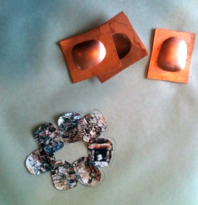 I then turn over the piece so that the wires are exposed and with a mini torch, I ball up the wires until they lay flush with the interior surface. I then weld the two halves together and enamel. The most difficult part of this is to weld the copper without melting the silver findings as the melt temperatures between silver and copper are so different.