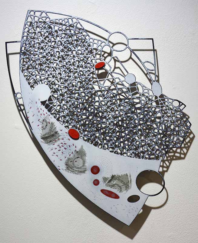 Stairway to Heaven, laser cut steel, enamel, laser engraving, felt